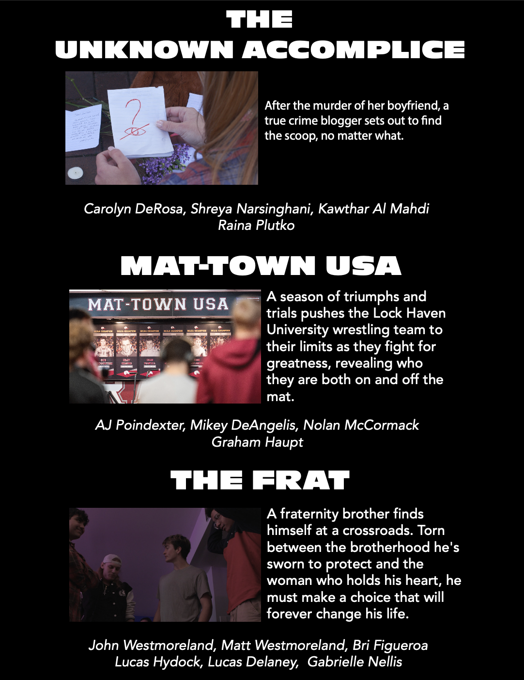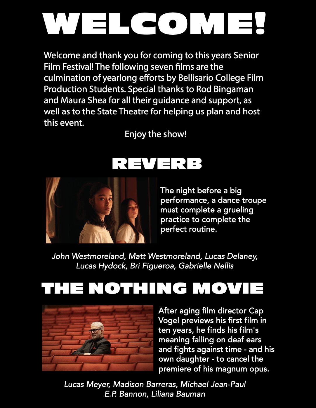 In my senior capstone class for Film Production, 7 groups spent the year creating short films. At the end of the year, we were able to host a premiere to showcase our work at the State Theatre. I worked with my professor, The State Theatre, and other students to create branding for the event which included a poster, banner, and pamphlets.