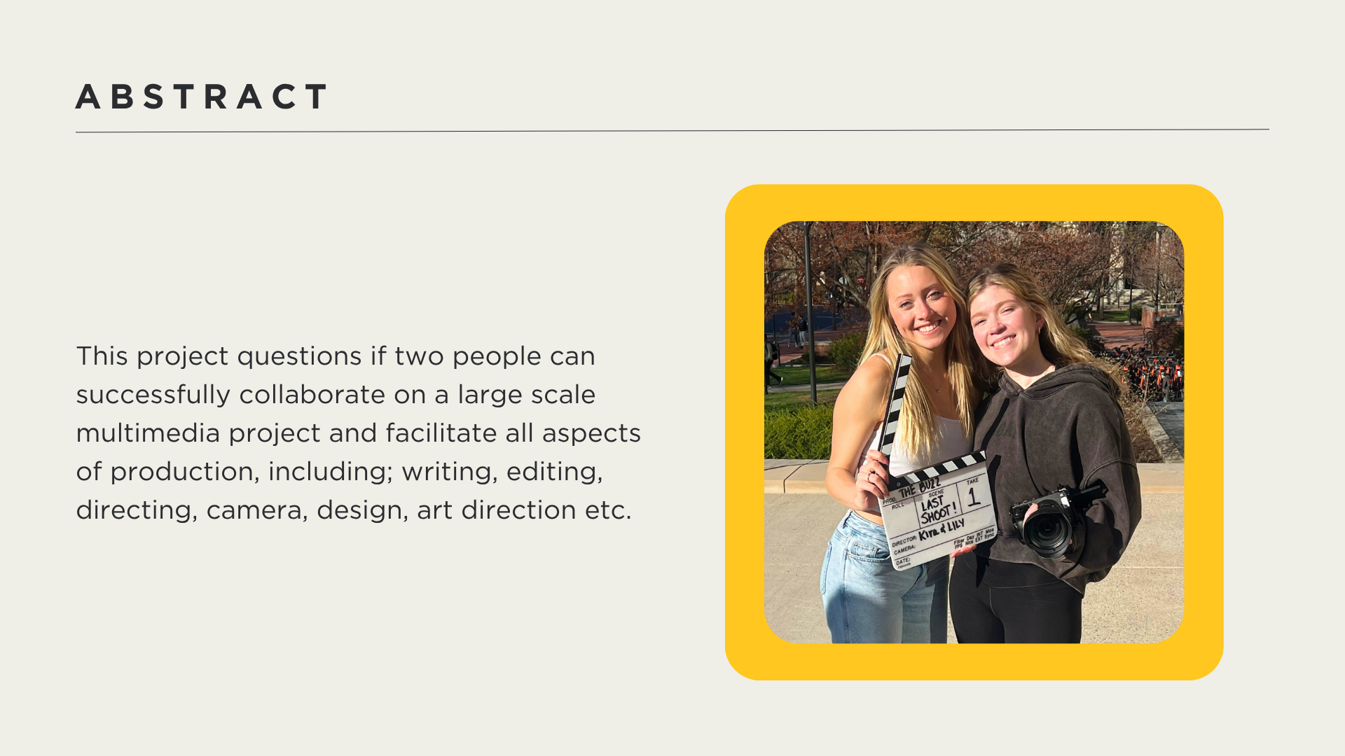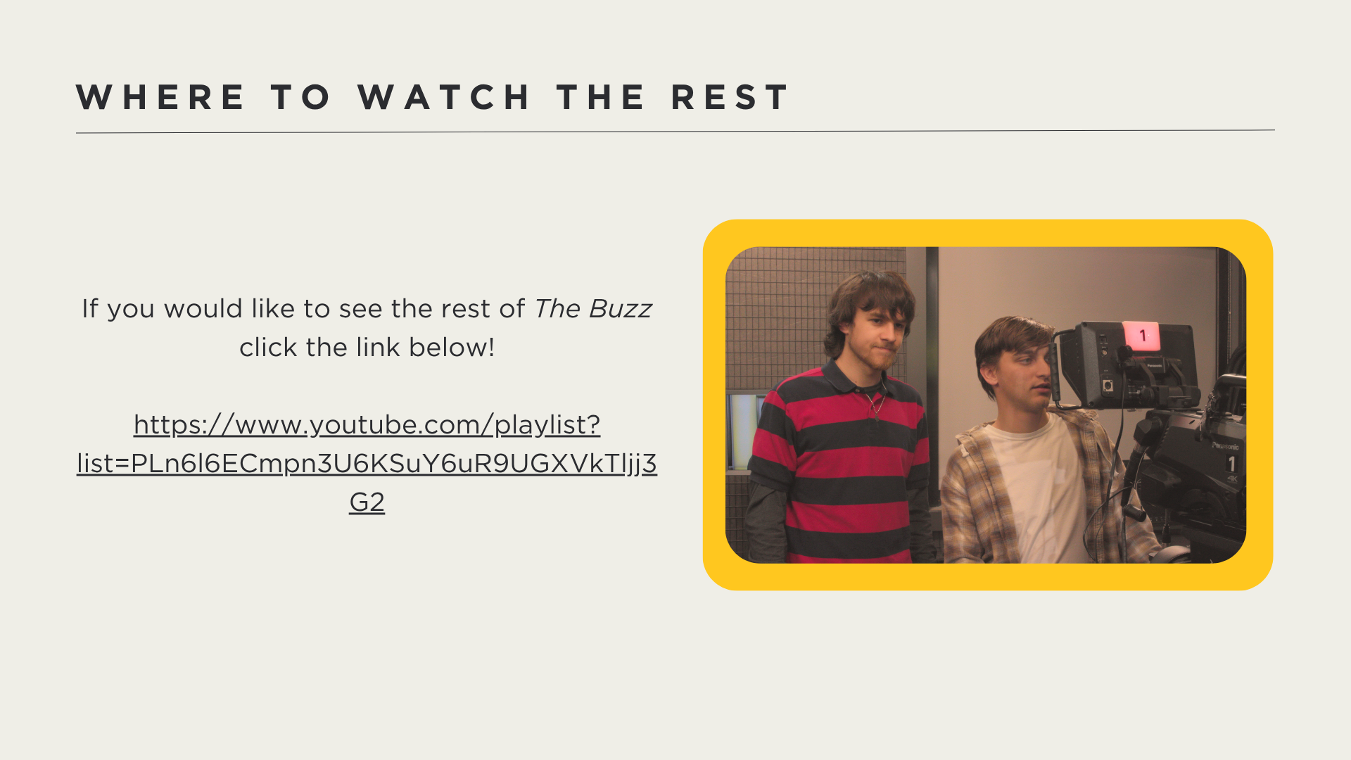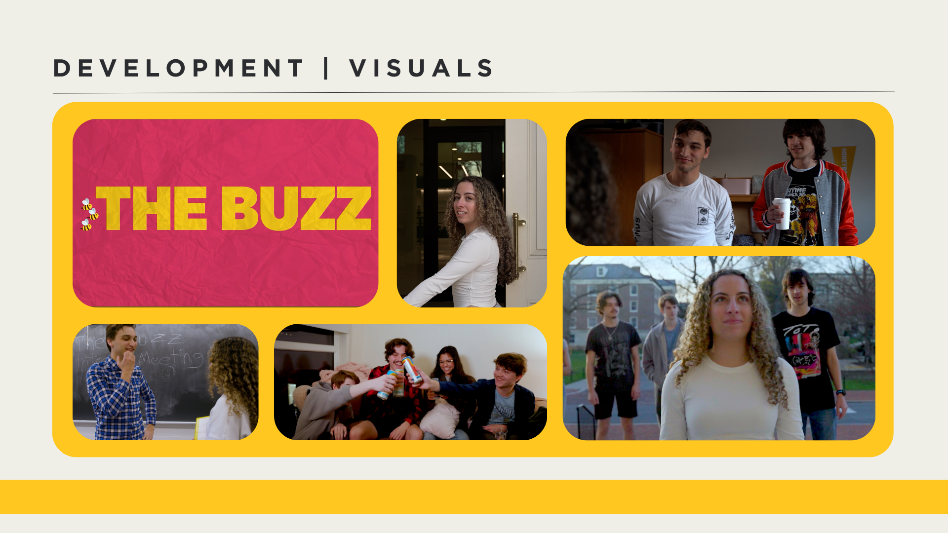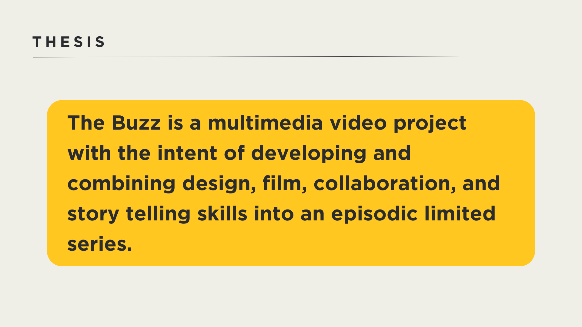 The Buzz is a mini sit com developed for my Digital Art and Media Design Thesis. This project was co-created with Kira Smith. My lead jobs were Director of Photography, Producer, and Art Direction.